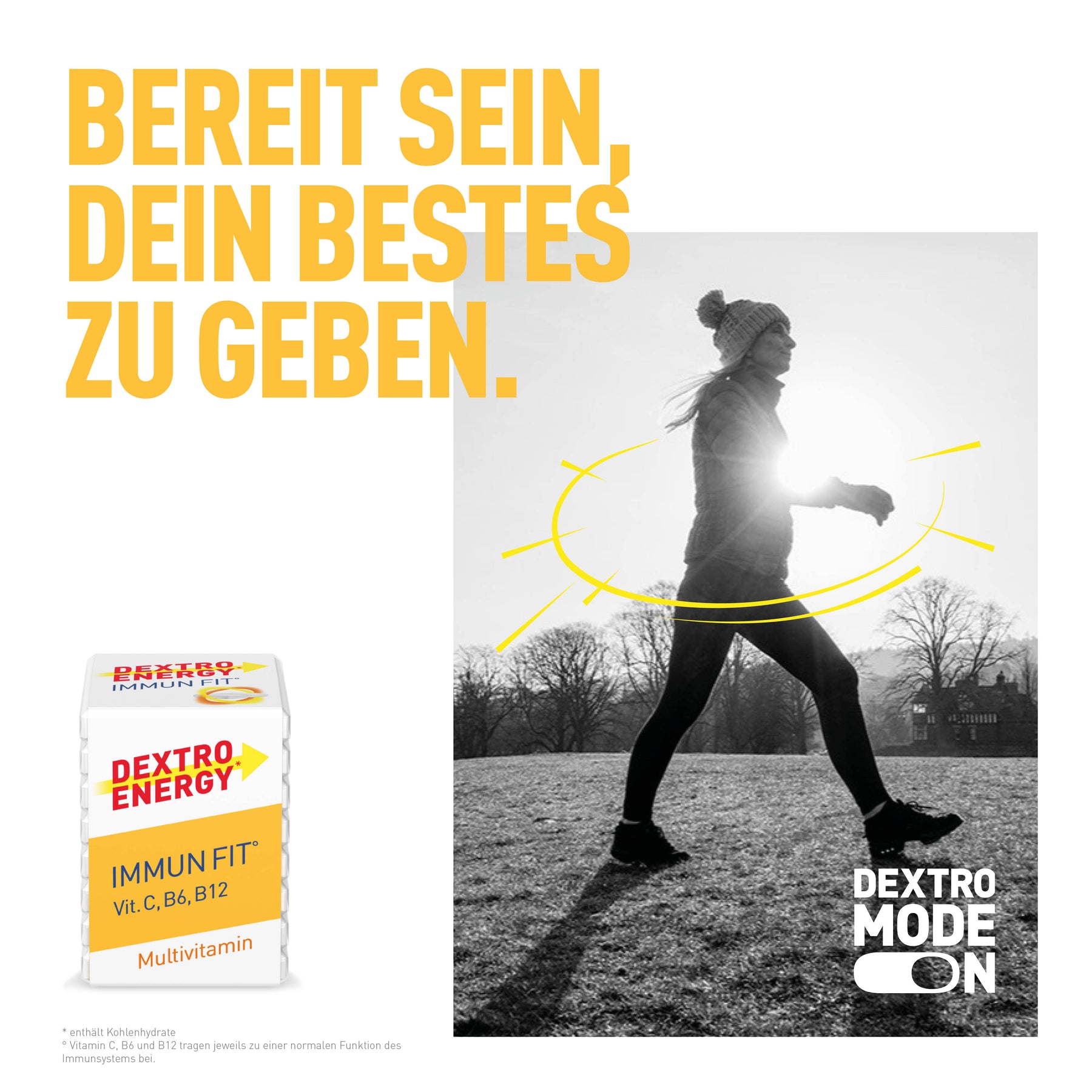 Entdecke jetzt Dextro Energy* Immun Fit° und schnapp dir deine leckeren Traubenzuckertabletten mit 10 Vitaminen – das ganze Jahr über, für jede Herausforderung!