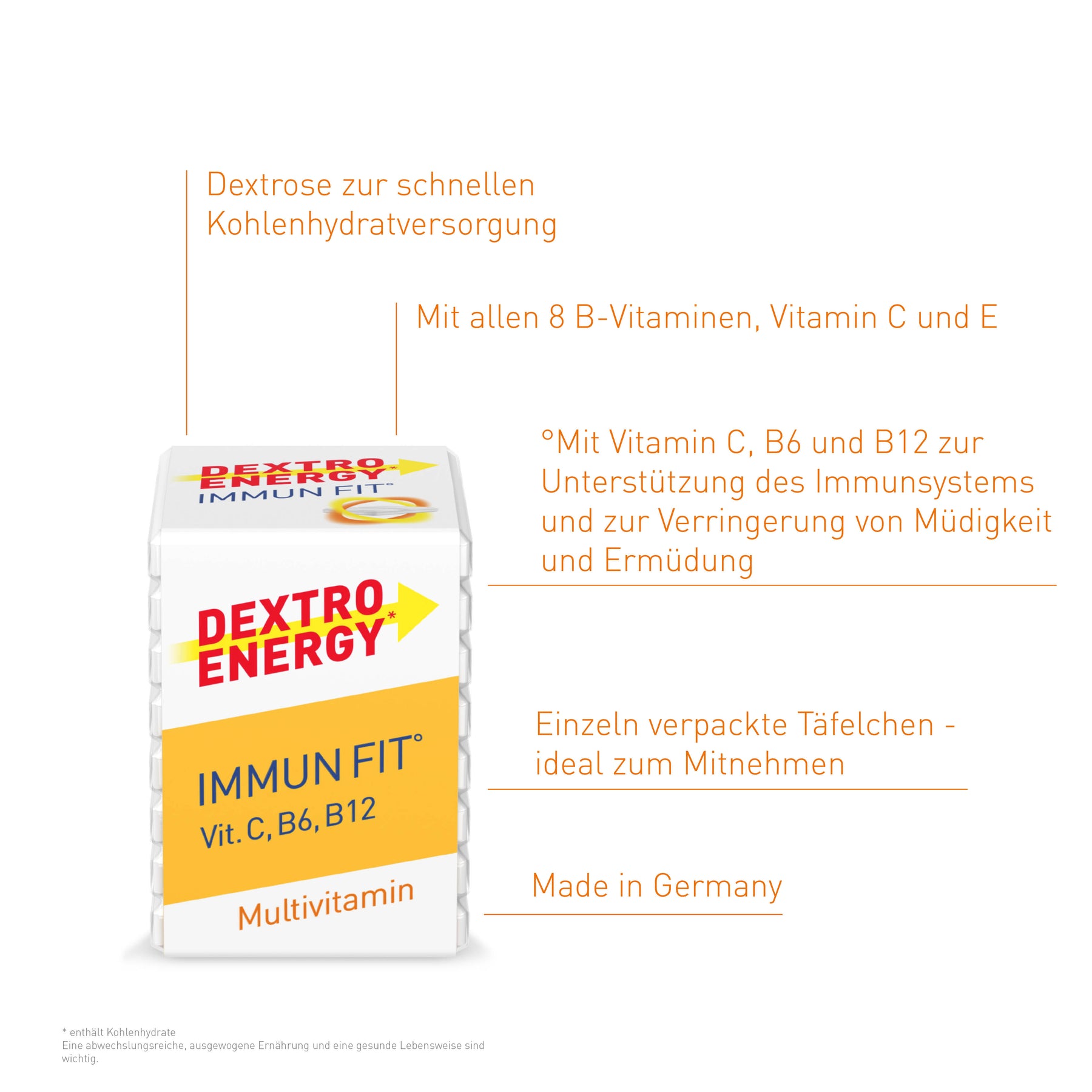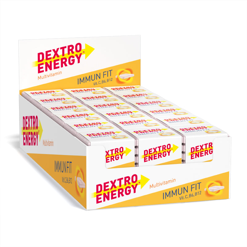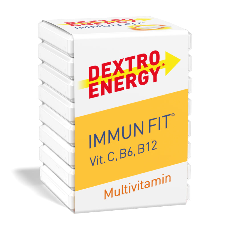 Dextro Energy* Immun Fit°: Das sind unsere köstlichen Traubenzuckerwürfel für dein Immunsystem – gedacht für das ganze Jahr, für deine nächste Präsentation, für dein kommendes sportliches Highlight. Denn hier bekommst du deinen Traubenzucker – und noch eine Menge mehr. Immun Fit° bedeutet bei uns nämlich: Dextrosetabletten plus Multivitamin. So kannst du deinen Körper mit schnell verfügbaren Kohlenhydraten und essentiellen Vitaminen wie Thiamin, Riboflavin, Vitamin E, Niacin, Biotin, Folsäure und Pantothensäure versorgen. Die Kombination aus Vitamin C, B6 und B12 kann dabei helfen, dein Immunsystem zu unterstützen, während Dextrose deinen Körper mit Nährstoffen für Muskeln und Gehirn versorgt. Ob beim Sport, beim Familienausflug, in der Uni oder im Büro: Dein Immun Fit° Traubenzucker ist einzeln verpackt, der Würfel passt zudem in jede Tasche. So kannst du dich immer und überall jeder Herausforderung stellen und auf den Punkt genau abliefern – und danach optimal Kraft tanken.