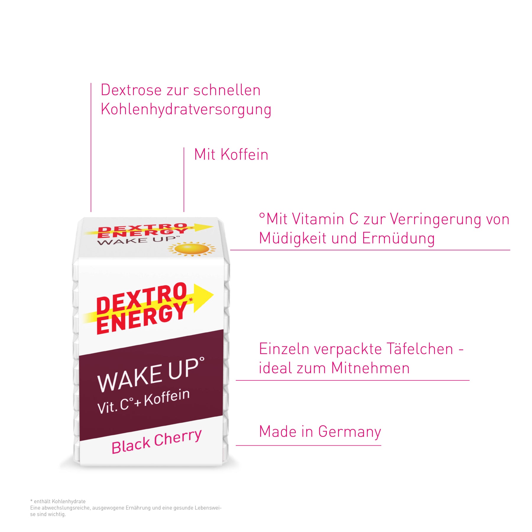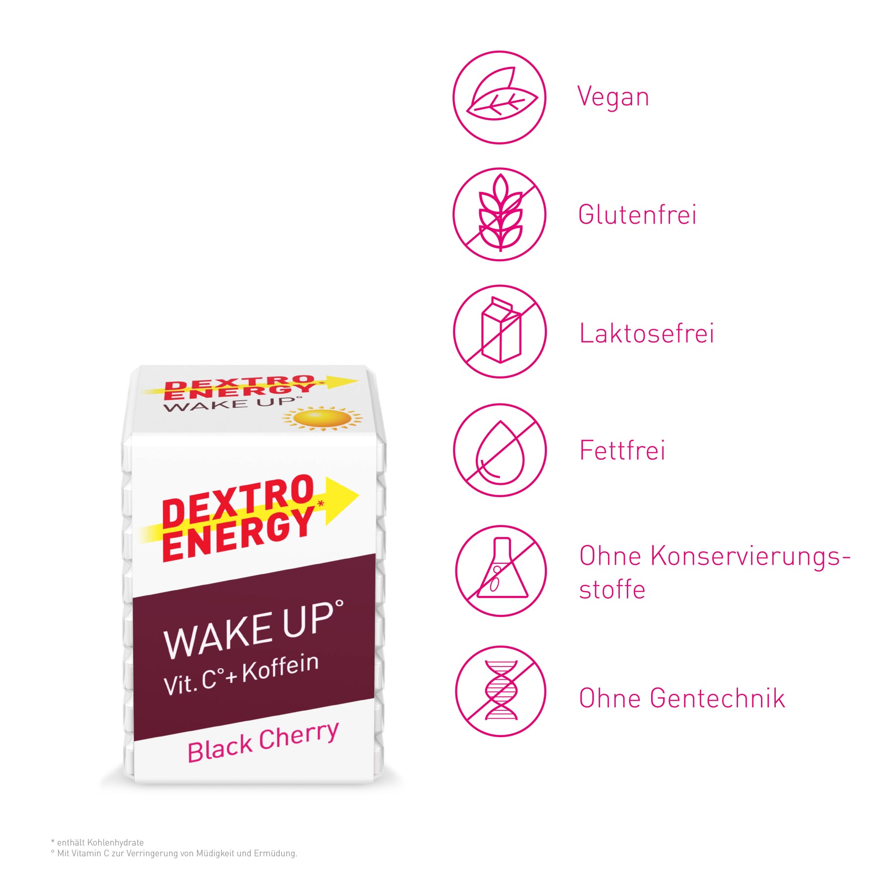 Ganz neu, ganz lecker: unser berühmter Würfel als Wake-Up°-Variante. Du bist gerne bestens ausgerüstet, wenn du neue Herausforderungen angehst? Bei uns kannst du jetzt deine Tabletten mit Koffein, schnell verfügbaren Kohlenhydrate und Vitamin C kaufen. Und während die meisten Koffeinprodukte eher bitter schmecken, bekommst du bei uns den extra leckeren Black-Cherry-Geschmack. Ehrensache: Wake Up° ist garantiert glutenfrei und vegan – und authentisch, denn: Das Koffein stammt aus der grünen Kaffeebohne. So, wie es sein soll. Ob beim Lernen, bei der Arbeit oder beim Sport: Mit unseren leckeren Tabletten mit Koffein kannst du abliefern!